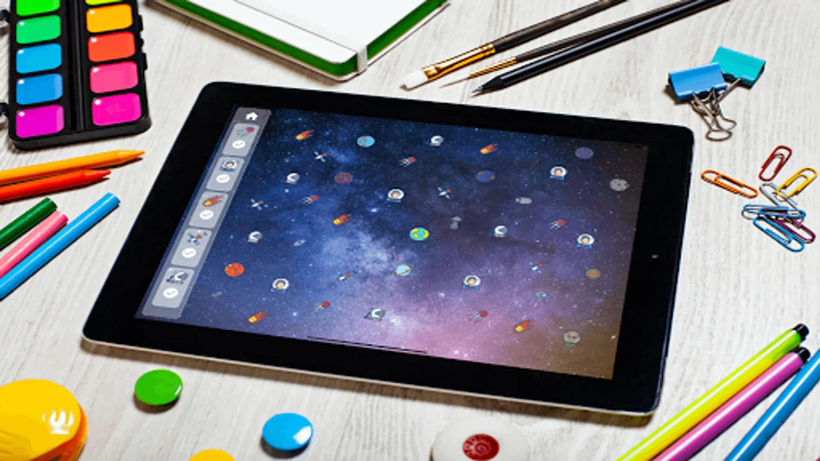 Search and find game prepared for preschool children; There are 5 items hidden in eight different themes: space, sea, vehicles, fruits, shapes, forest, farm, expressions.