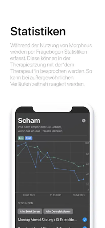 Morpheus hilft Therapeut*innen und Patient*innen stündlich und gesamtheitlich den Therapiefortschritt zu überwachen, indem eine Übersicht über Prä- und Post-Evaluationen dargestellt werden.