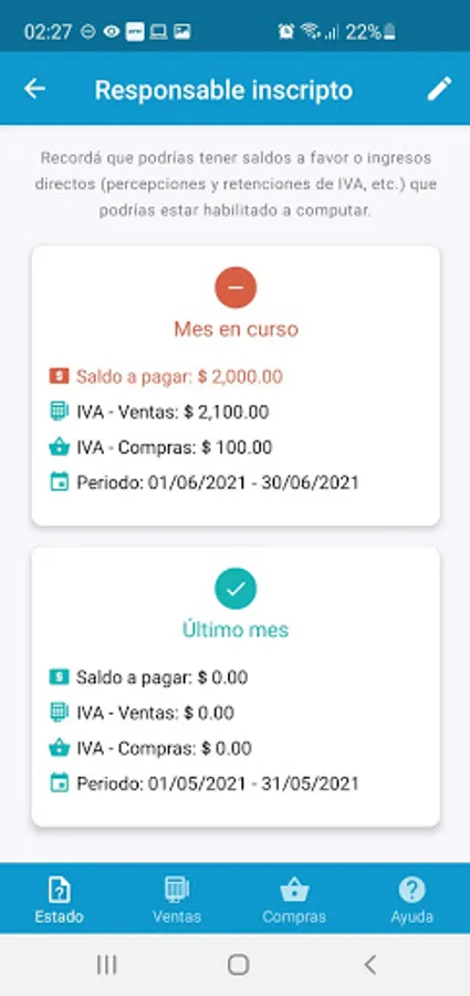 Record the amounts of your billing and calculate the balance in favor or to pay of the previous month and the accumulated of the current month.