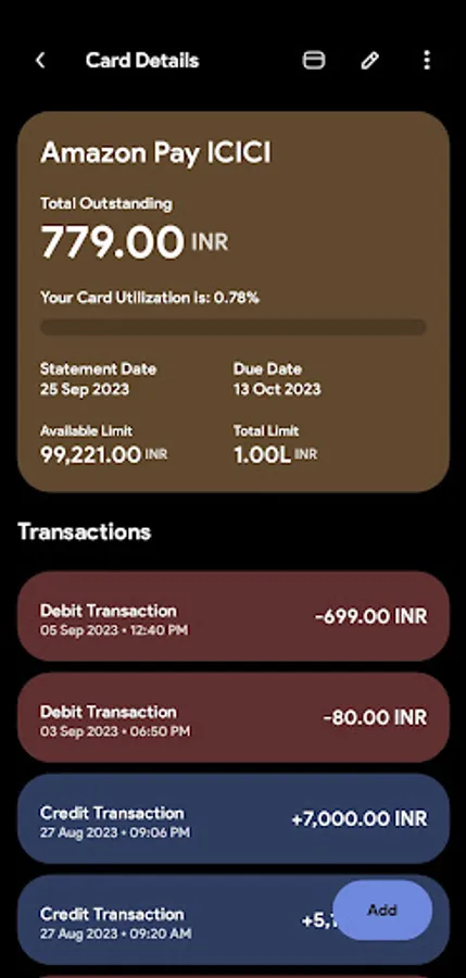 • Track your total balance, available limit, and credit utilization ratio.