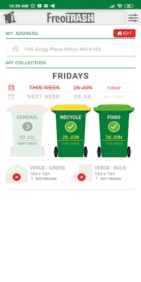 Just enter and save your address and your household bin and verge collection schedule will be pinned to the main screen of the app.