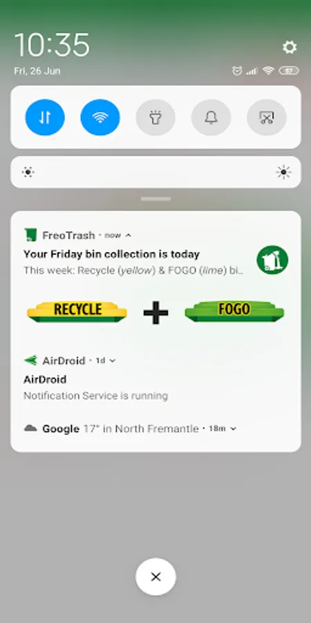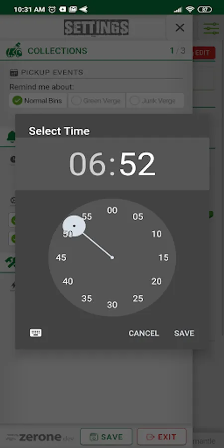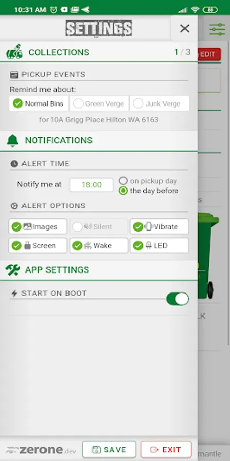 In the settings menu you can select what type of bin/verge collections you want to be notified about, nominate the day and time the notification will be triggered and configure basic characteristics of the notification itself.