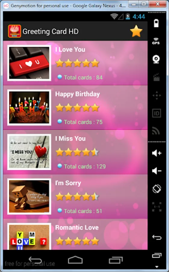 With this app, you can send greeting cards to friends with categories : Valentines, Happy Birthday,Women's day, Christmas,I miss you, Sorry, Good morning...