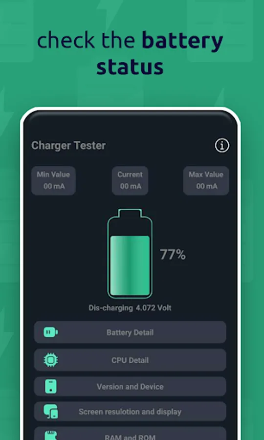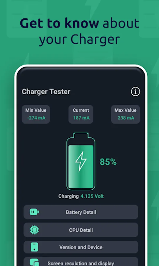 Using this smart app is way much simple rather than applying concrete science. Just open the app and connect your charger and wait for a minute. Then you will see the charging/discharging current and minimum and maximum value of mA on the display screen..