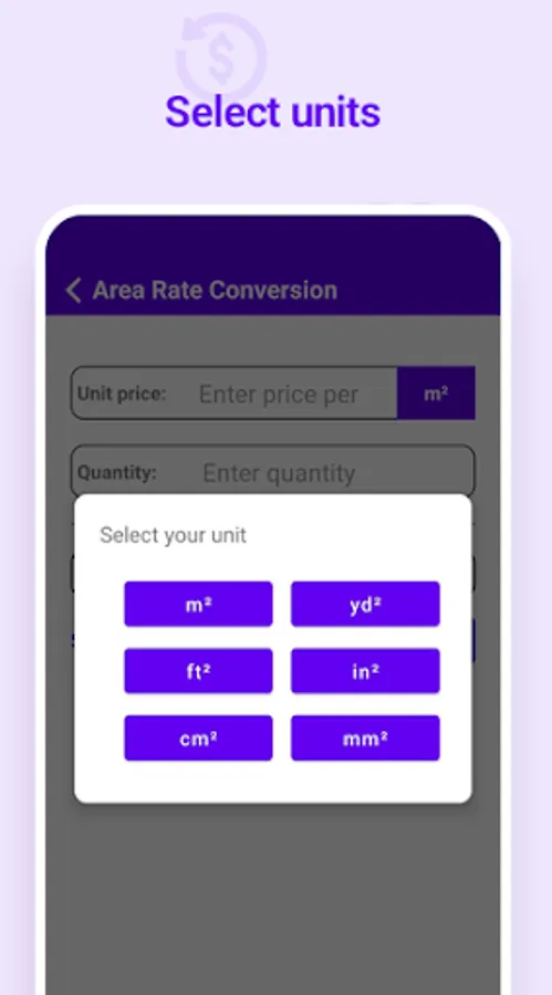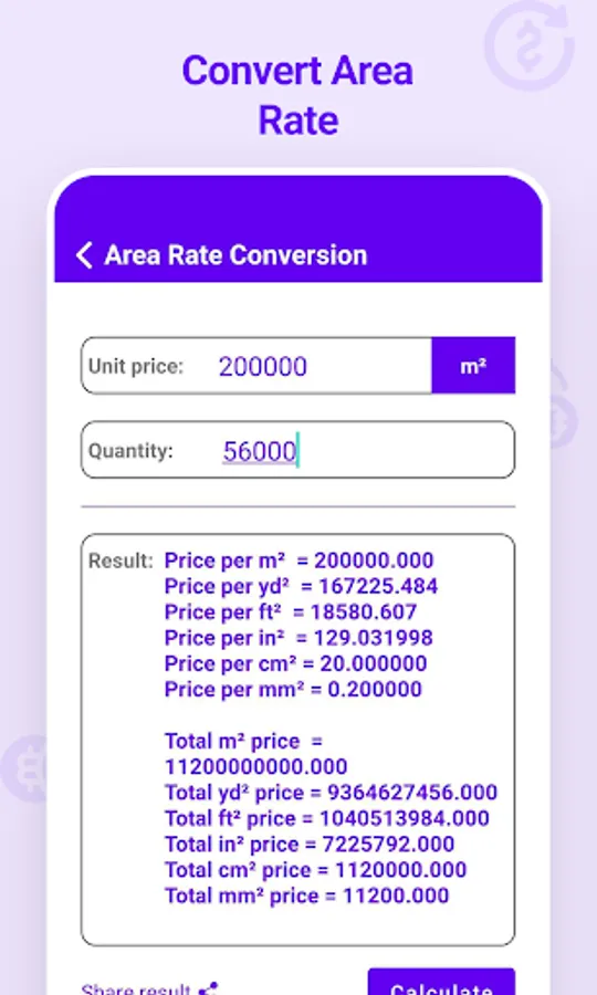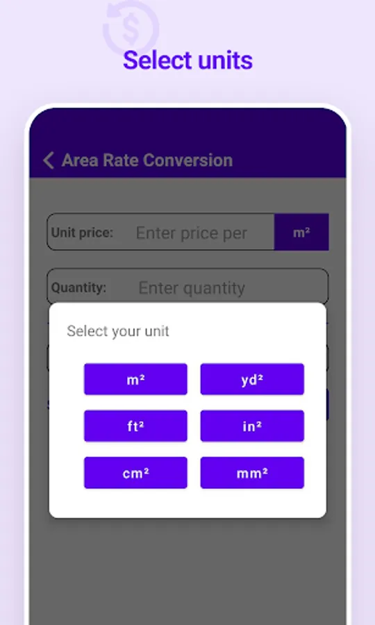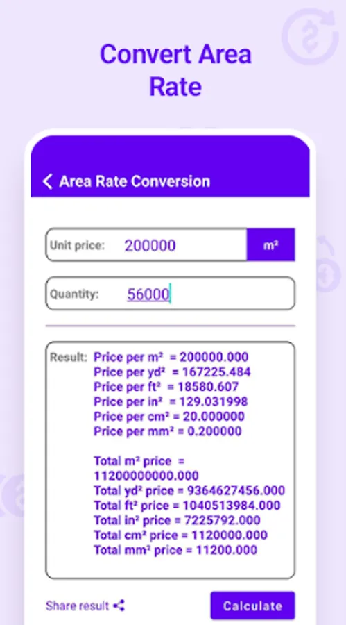 • Convert rate of area (m², yd², ft², in², cm², mm²)