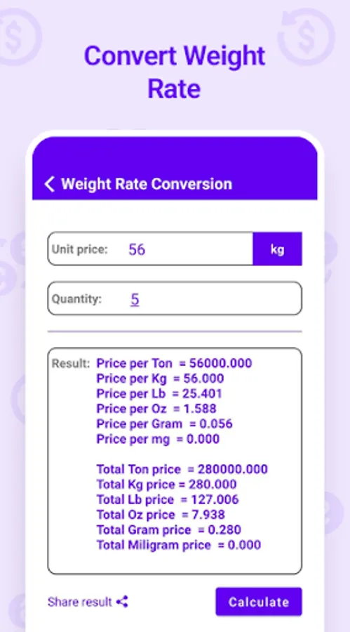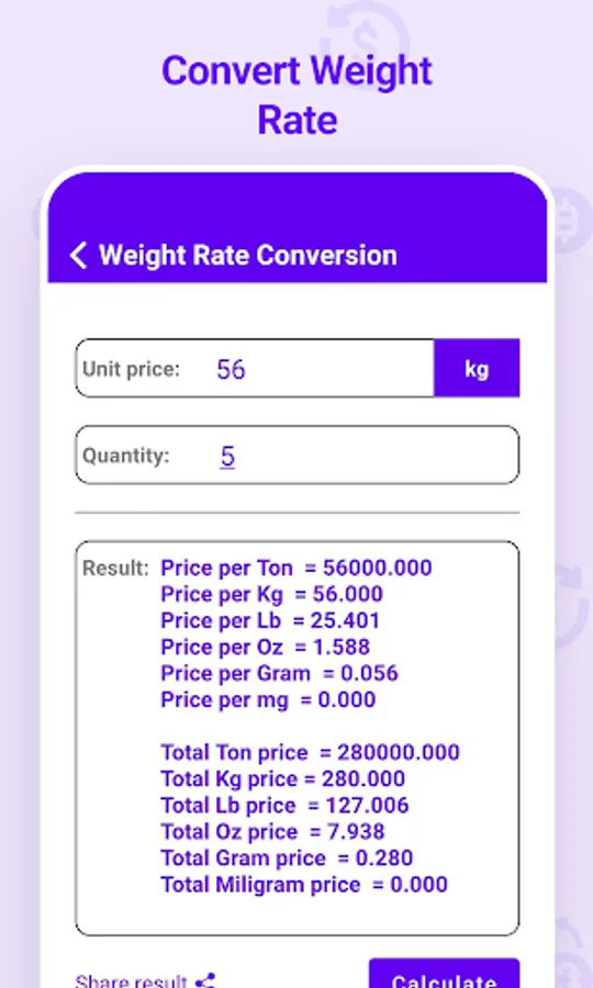 • Convert rate of weight (ton, kilogram, pound, gram, ounce, milligram)