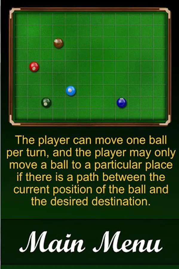 The game starts with a spacious board with five balls chosen out of seven different colors. The player can move one ball per turn, and the player may only move a ball to a particular place if there is a path between the current position of the ball and the desired destination. After your turn, three more balls are dropped onto the field. Thus, every next move is going to be more and more difficult! The goal is to remove balls by forming lines (horizontal, vertical or diagonal) of at least five balls of the same color. If the result of a move has made a line disappear, the next portion of balls will not appear immediately. The goal is to reach the maximum score. Points are given every time you manage to remove some balls from the field.