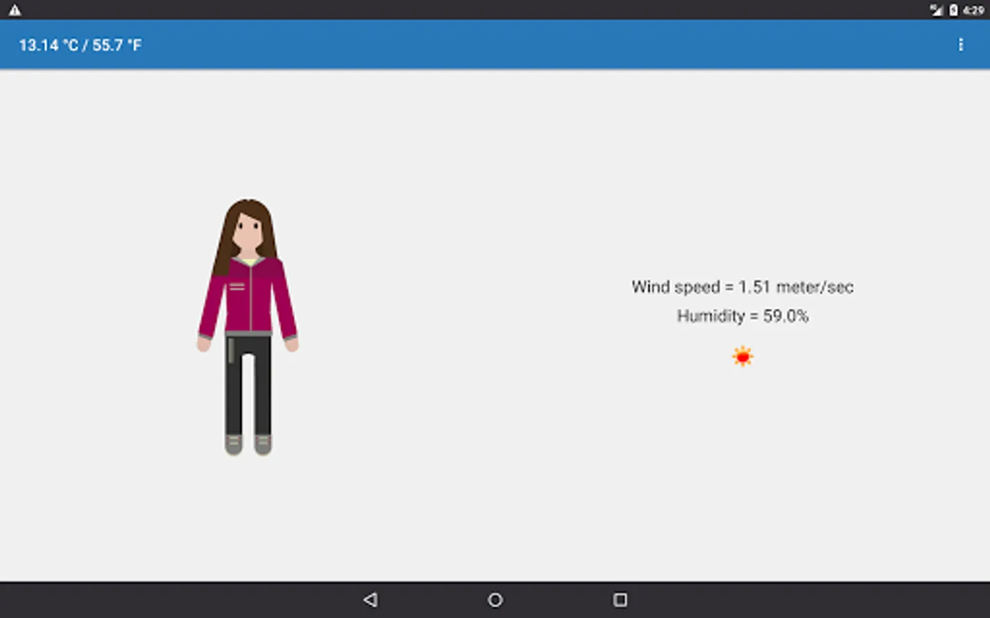 "Clothing and Weather" is a great solution for those who doubt what clothes to wear when leaving home. Depending on the purpose of your going out into the street, whether it's a business meeting, playing sports or meeting friends, it will also pick up your approximate clothes depending on the weather conditions.