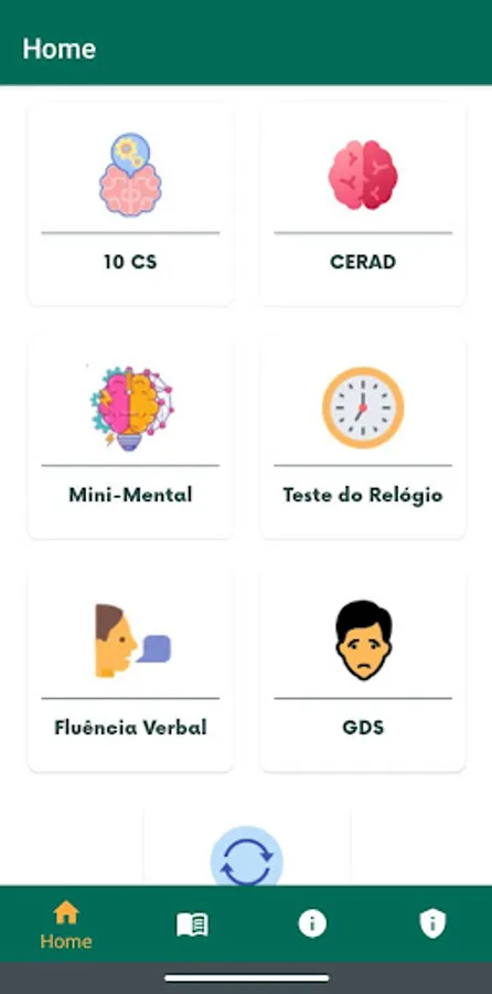 Based on this detail, the structure of the educational technology was defined as follows: the main screen has seven icons, six of which expose the following cognitive screening protocols each: 10 – Point Cognitive Screneer (10- CS); Consurtiom to Stabilize a Registry for Alzheimer’s Disease (CERAD), better known as the Word List Test; Mini Mental State Examination (MMSE); Clock Test (TR); Verbal Fluency Test (VF) and Geriatric Depression Scale (GDS-15). The seventh icon presents the topic Guidance and Referrals, which discusses possible diseases that may occur with cognitive decline and how to proceed after applying the tests.