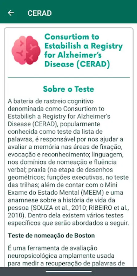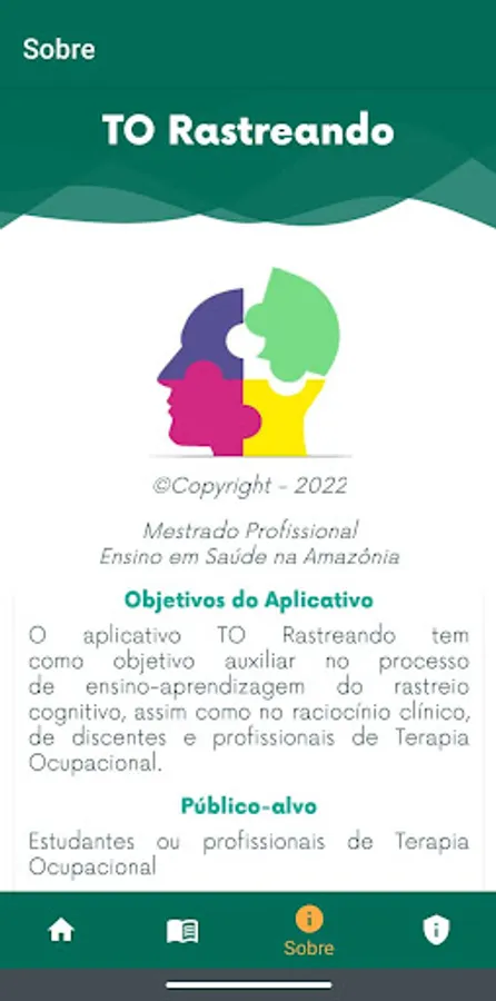 The TO Rastreando Application is composed of textual materials that explain the selected protocols, from the cognitive domains they assess, their application, scoring and interpretation, to the guidelines and referrals to be taken based on the result found. In each tab referring to the tests, you can see the explanation about the use and interpretation of the referred instrument, the protocol itself and its validation article in Brazil.