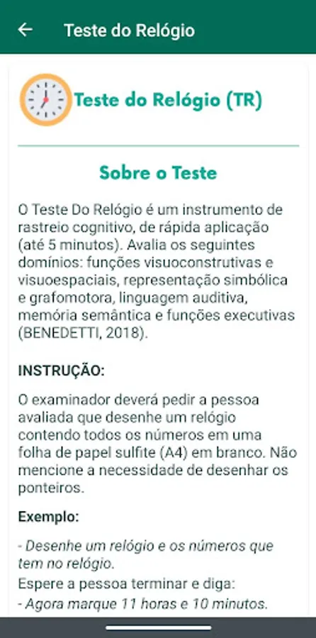 It is important to point out that the icon referring to the Clock Test does not provide the protocol itself because, according to the validation article used, the circle design referring to the clock already constitutes an element to be evaluated.