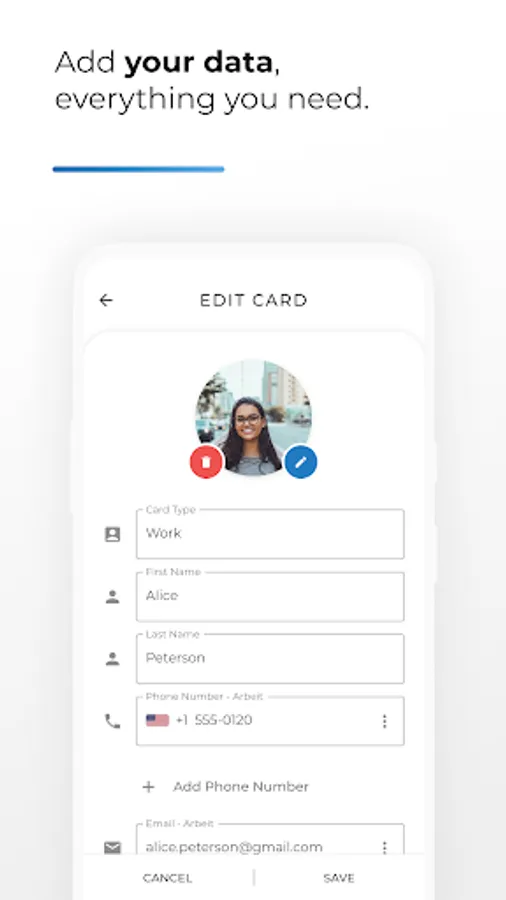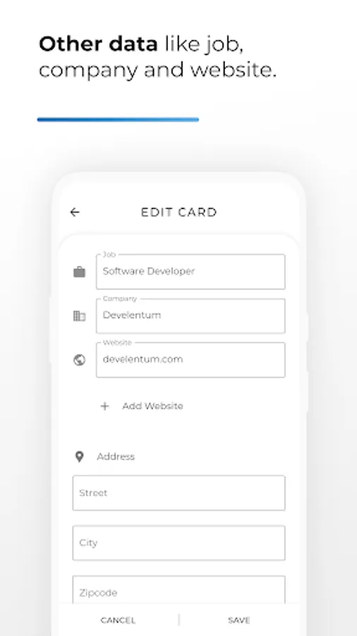 • Include any amount of information on your business card, including name, contact details, website, address, company information, social profiles, and more.