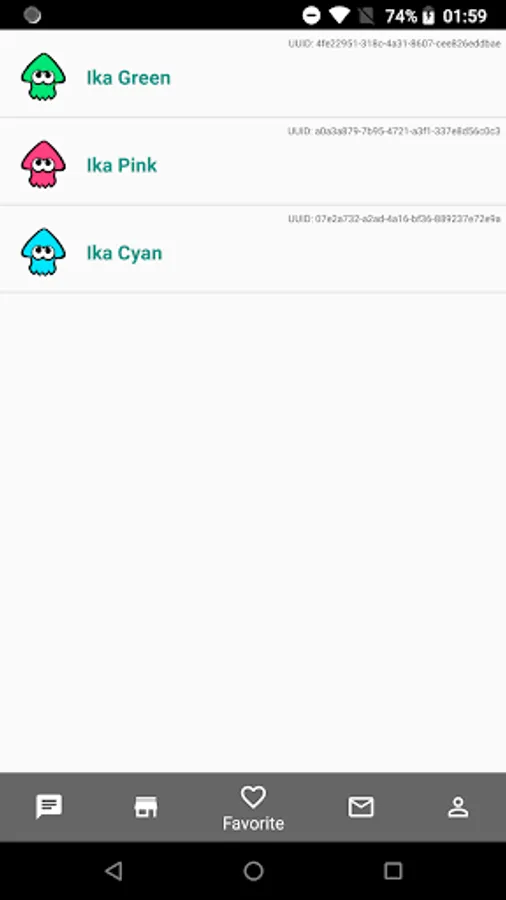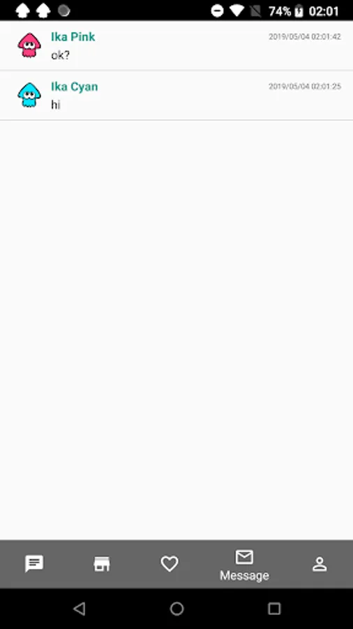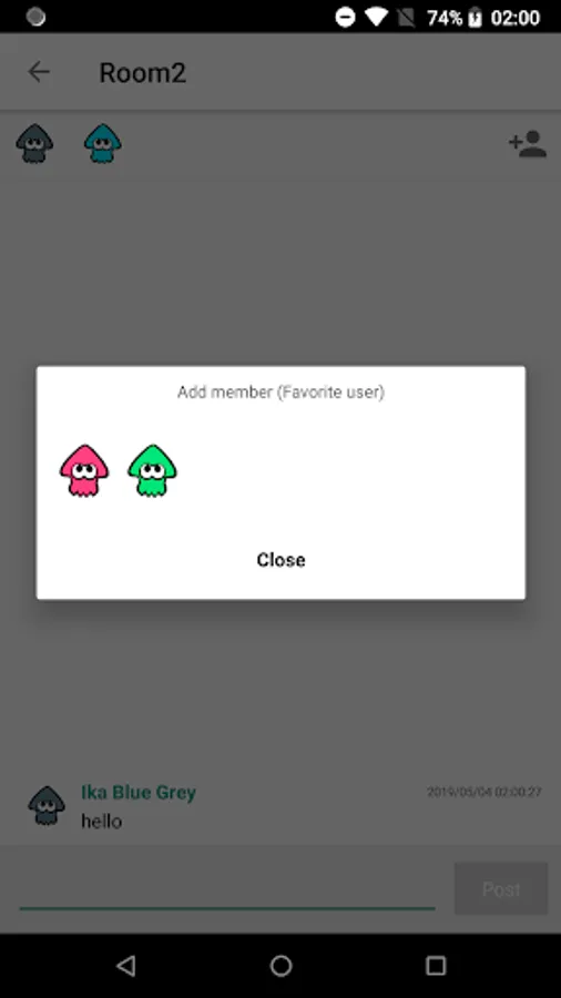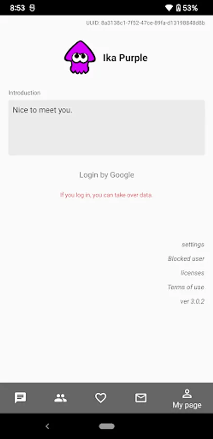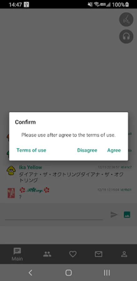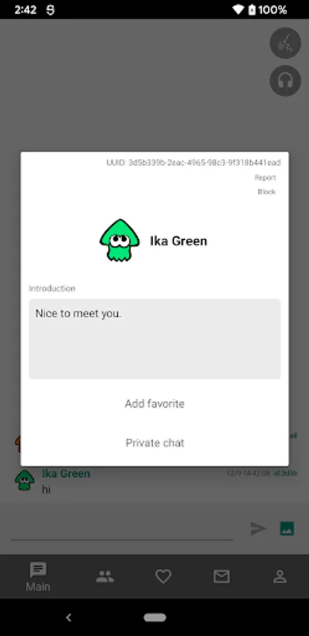 You can enjoy chatting by setting profile picture, user name and profile text. You can also set any locally stored image as your profile picture, in addition to the squid image. The main chat rooms are main, group, and individual. Posted comments can be read aloud, and a voice chat function is also provided for each room.