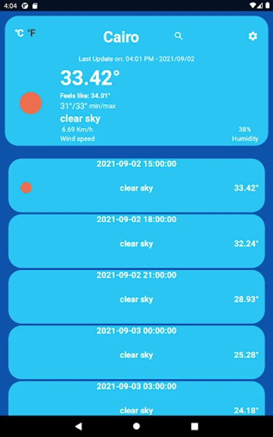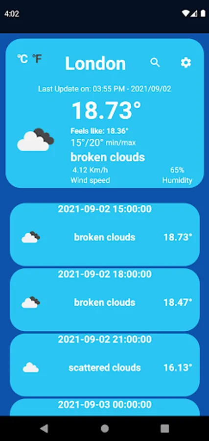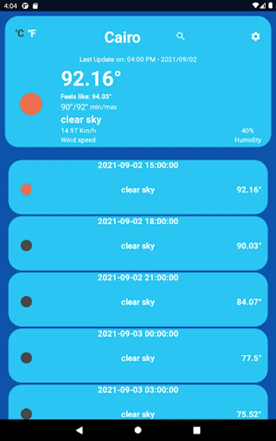 This app show the current weather (temp., feel like, wind speed, and humidity) plus the next 6 days.