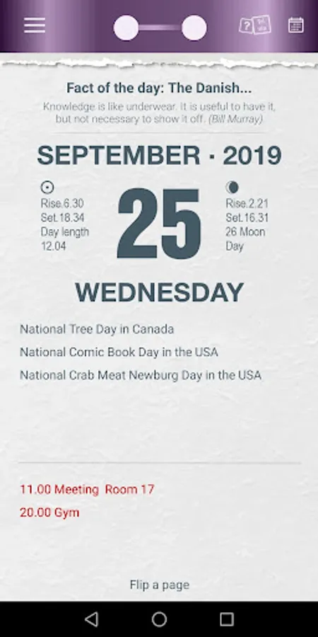 Page-a-Day paper wall calendars were very popular in the last century. We hope to make our application the same indispensable assistant on your mobile device, designed in the style of a classic Page-a-Day calendar, while taking advantages of modern technologies.