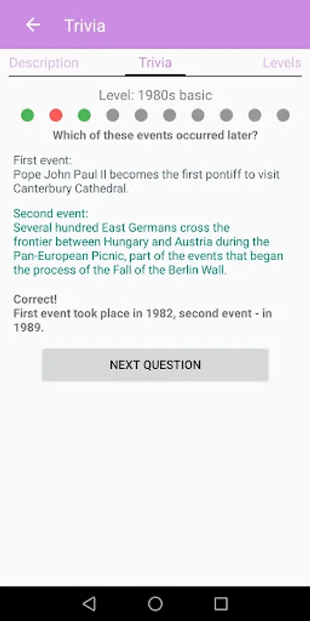 The built-in trivia quiz game will help to develop your knowledge of various historical eras.