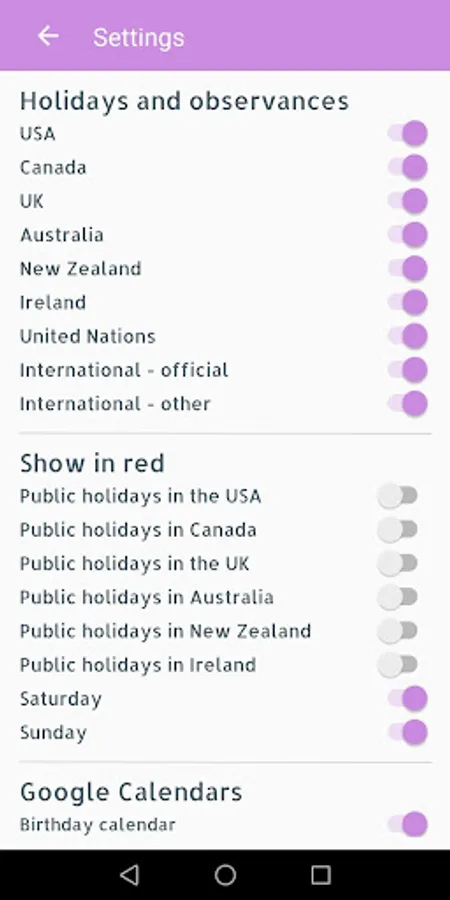 Select which culture’s holidays are displayed, based on your preferences and location (US, UK, Canada, Australia, New Zealand and Ireland).