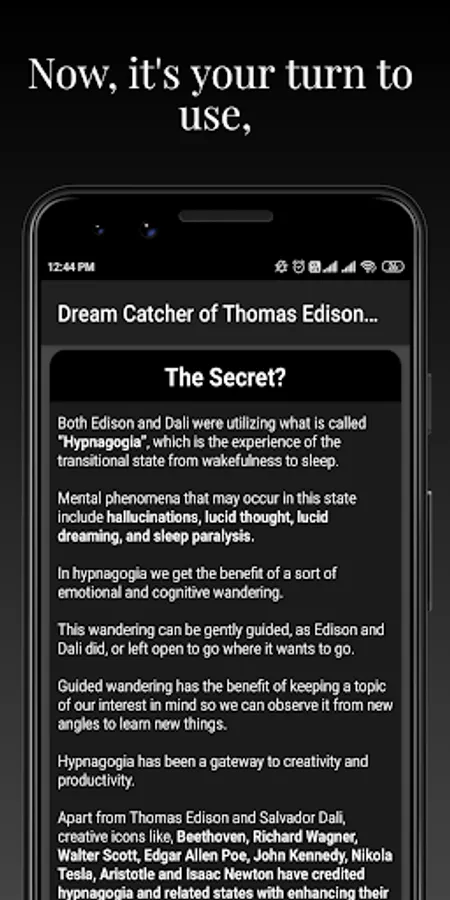 Apart from Thomas Edison and Salvador Dali, creative icons like Beethoven, Richard Wagner, Walter Scott, Edgar Allen Poe, John Kennedy, Nikola Tesla, Aristotle, and Isaac Newton have credited hypnagogia and related states with enhancing their creativity.