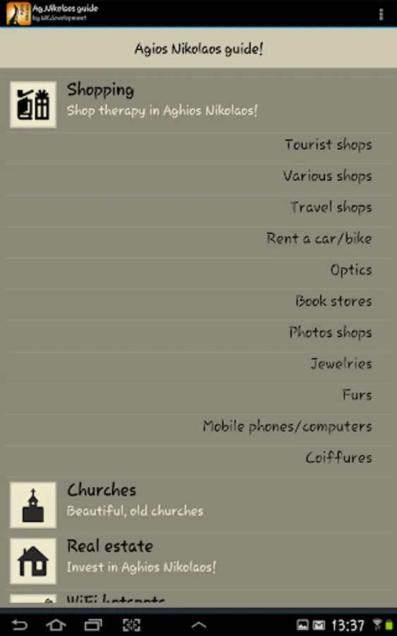 Essentials, Sights, Beaches, Banks, Pharmacies, Doctors, Fuel stations, Restaurants, Cafe-bars, Accomodation, Shopping, Churches, Real estate, Wifi hotspots etc.