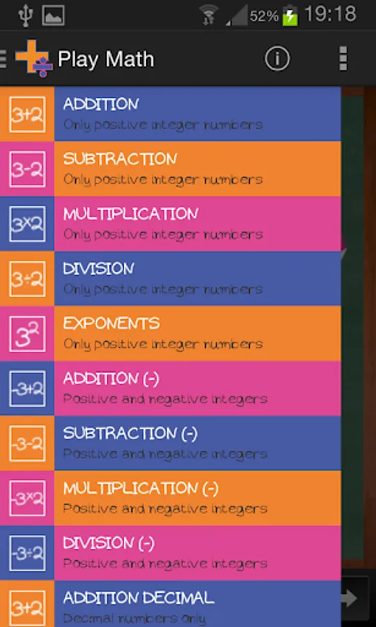 Play Math is a mathematical game to play for fun or to exercise yourself or your kids at some simple mathematical operations like Addition, Subtraction, Multiplication, Division and Exponents (using positive or negative integer numbers) and Addition, Subtraction, Multiplication between decimal numbers.