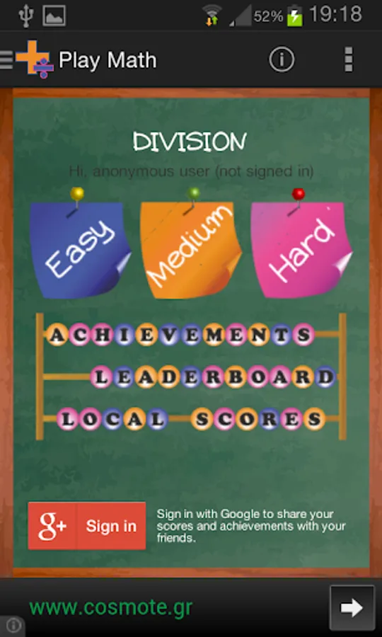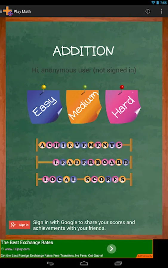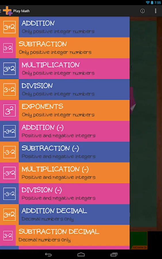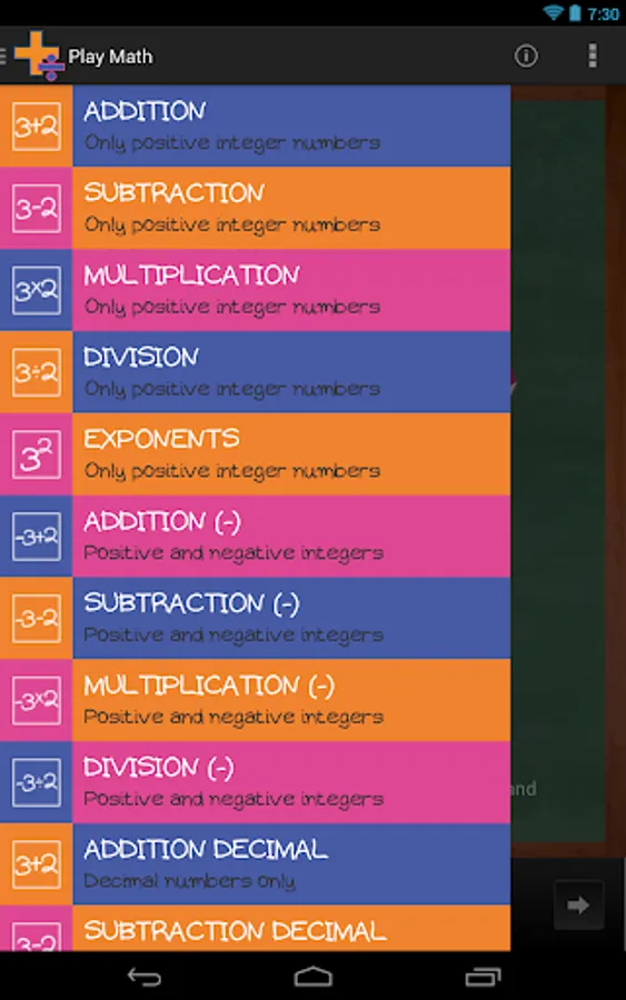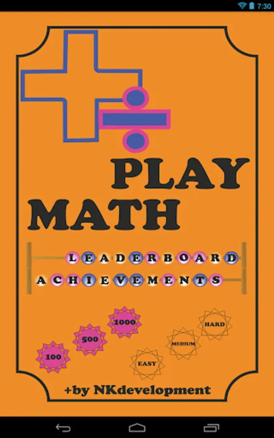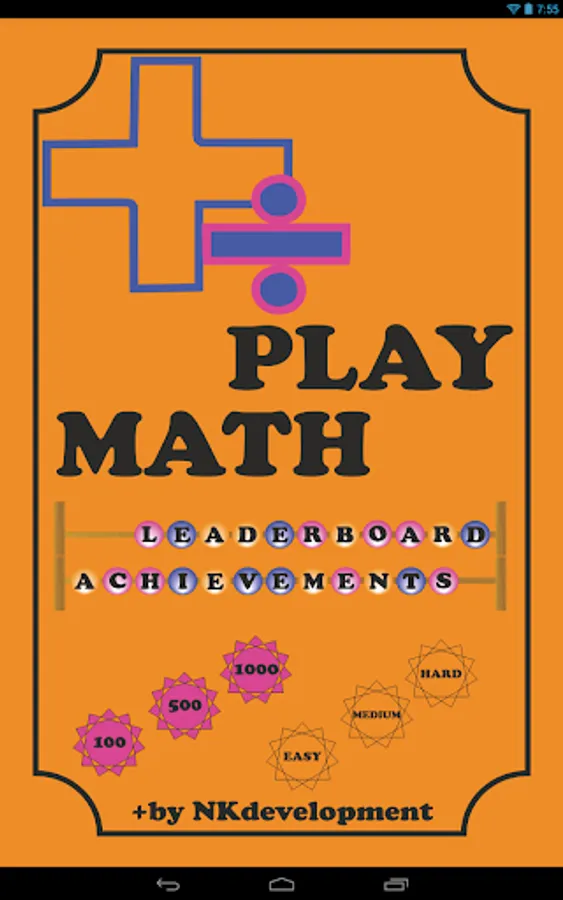 All operations can be played in three (3) different difficulty levels (easy, medium, hard) so that kids can play easy games and more experienced players can play hard games..
