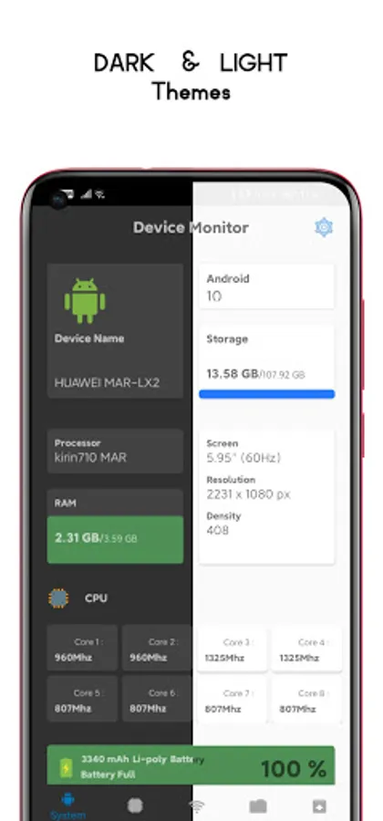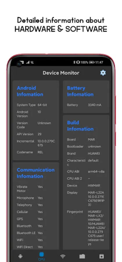 CPU-Z (Devmon) is a simple and powerful Android application that gives you complete information about your mobile device with advanced user interfaces. Device Info includes information about CPU, RAM, OS, Sensors, Storage, Battery, SIM, Bluetooth, Network, Installed Apps, System Apps, Display, Camera, Thermal, etc.