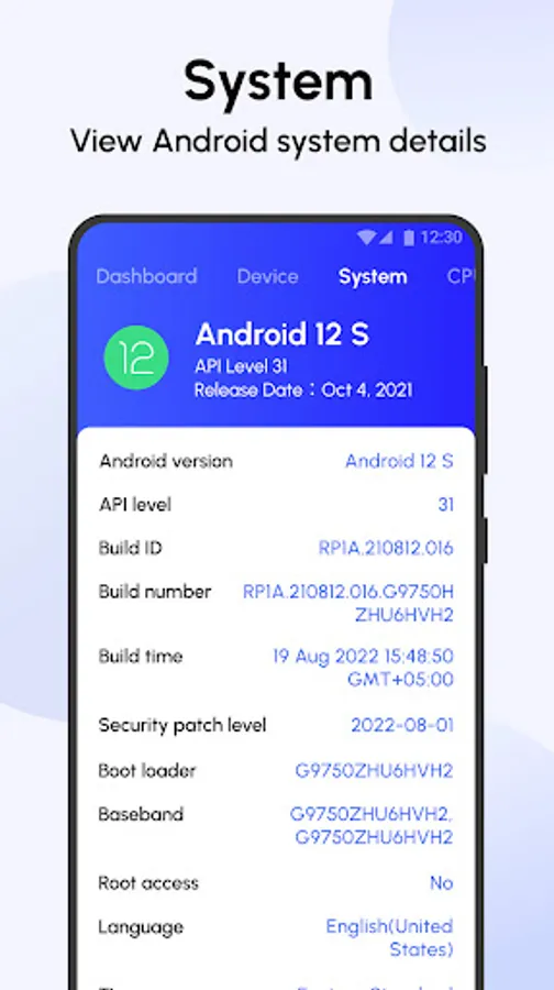Know Android version, build ID, build time, security patch level, boot loader, baseband, root access, time zone, uptime, Java runtime, OpenGL ES, DRM info, and a whole lot more.
