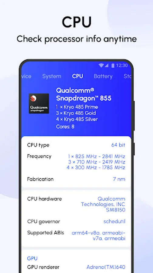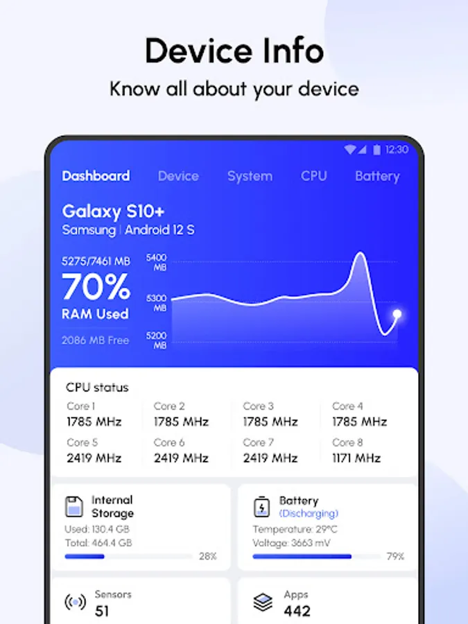 Comprehensive overview of model, CPU, GPU, memory usage, storage capacity, Bluetooth, battery status, sensors, display and camera...Get CPU's name, architecture, cores, type, frequency, fabrication and governor. Device info all in one!