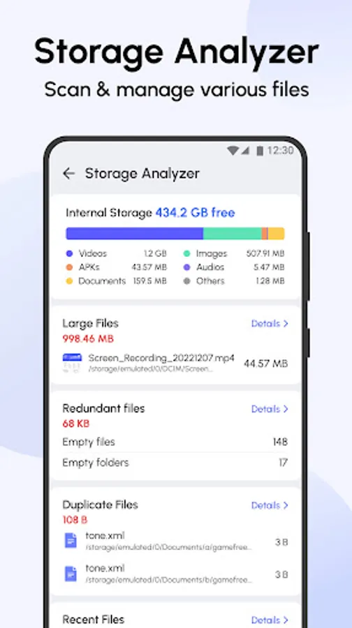 Quickly find & clean redundant files, duplicate files, large files and screenshots to free up more storage space.