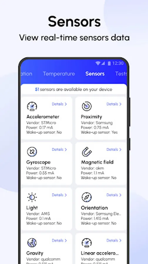 Look over all your device's sensor info, covering type, vendor, power, resolution, min delay, maximum range, reporting mode and more. View real-time data for accelerometer, proximity, gyroscope, magnetic field, light, orientation, etc.