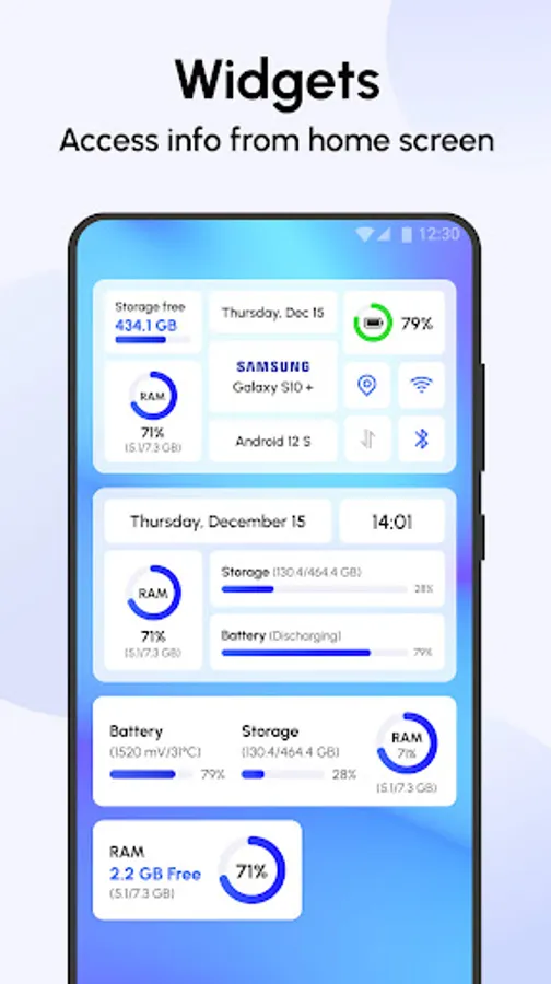 Simple widgets on the homescreen display various data in real time. Such as memory usage, battery status & voltage, WiFi/mobile connection, etc.