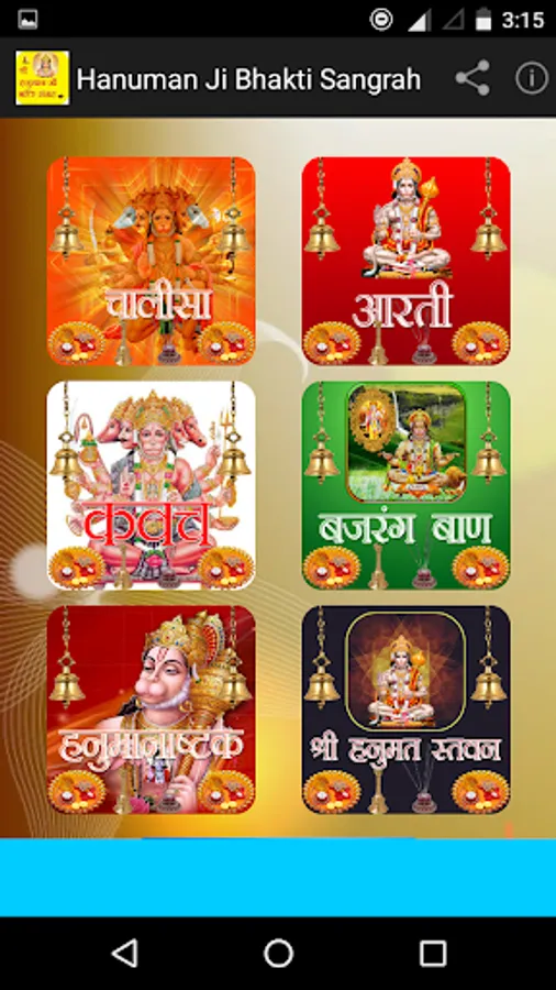 Lord Shri Hanuman Bhakti Sangrah app is a beautiful devotional combination of Chalisa, Sankatmochan Hanuman Astak, Shri Bajrang Baan, Stavana, Kavach and Aarti for Android in Hindi text lyrics and Mp3 or Audio format to Listen.