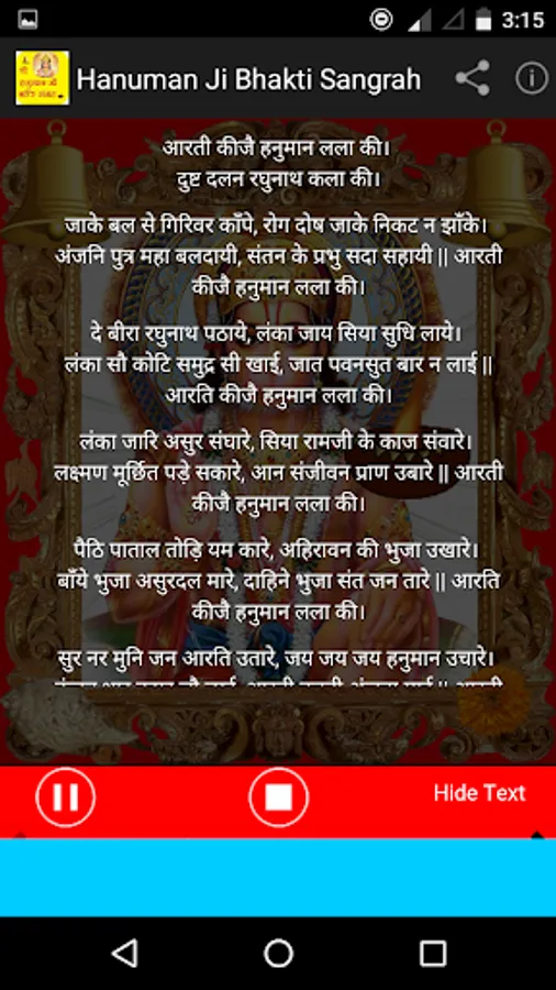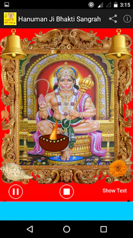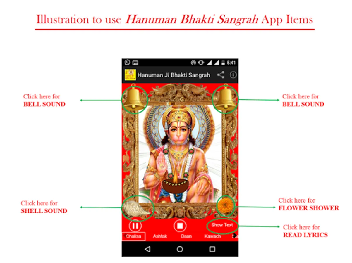 You will be happy to see such a nice collection with great presentation to Read and Listen or read with listen the Chalisa, Sankatmochan Astak, Bajrang Baan, Stavana, Kavach and Aarti with shell शंख & bell sounds and beautiful flower flow on the Lord Hanuman ji in user control in one single application with Lyrics and Mp3.