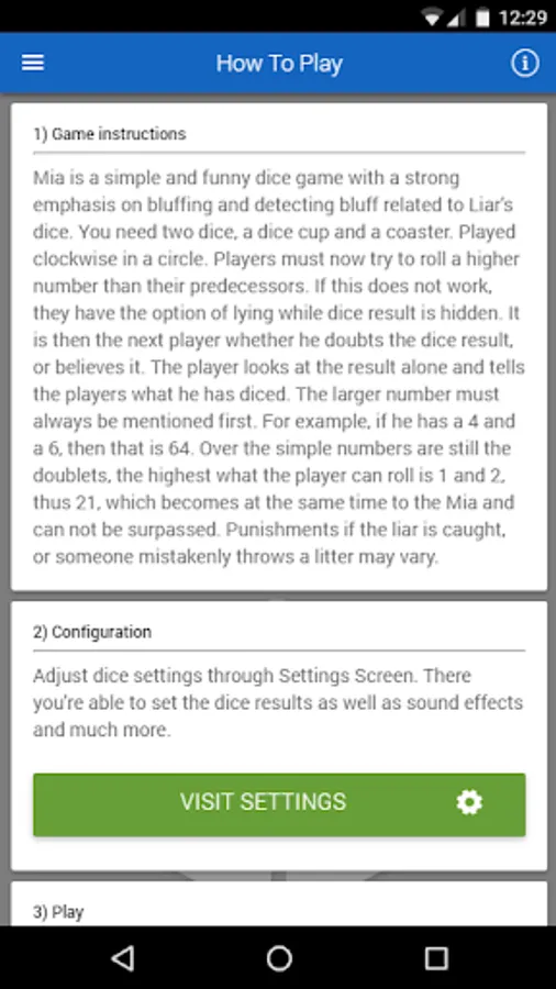 You do not have a dice, but would you like to play Mia? No problem, because this Dice-Game App brings you two dice and the dice cup to hide the result directly on the smartphone. Have fun while bluffing!