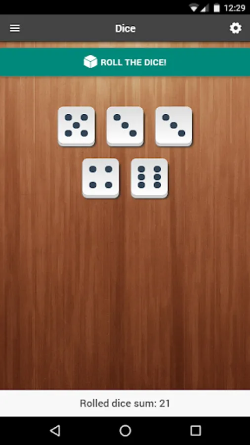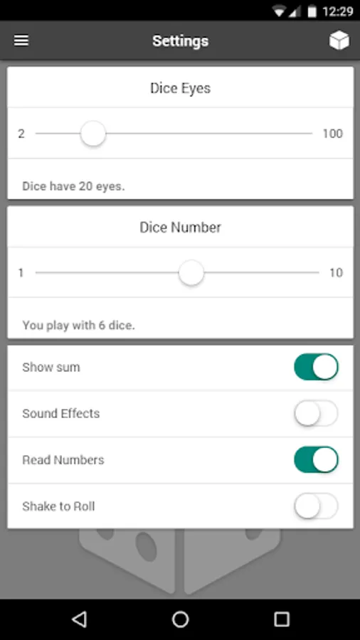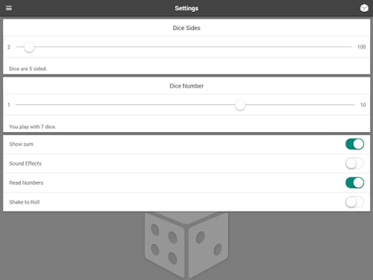 If you're tired of taping the button to roll, Dice! allows you to shake your device to roll the dice, if you enable this options in the settings. For individual customization, the user has control over Dice-Sides, number of Dice, Sound Effects, Sum, Speak out dice results and many more.