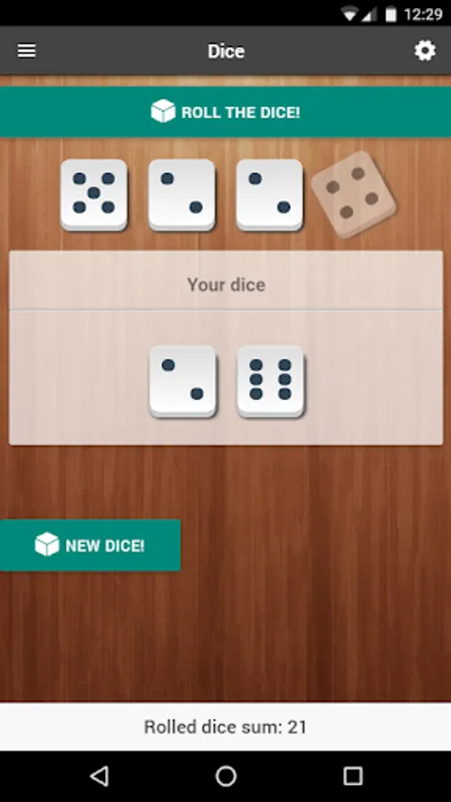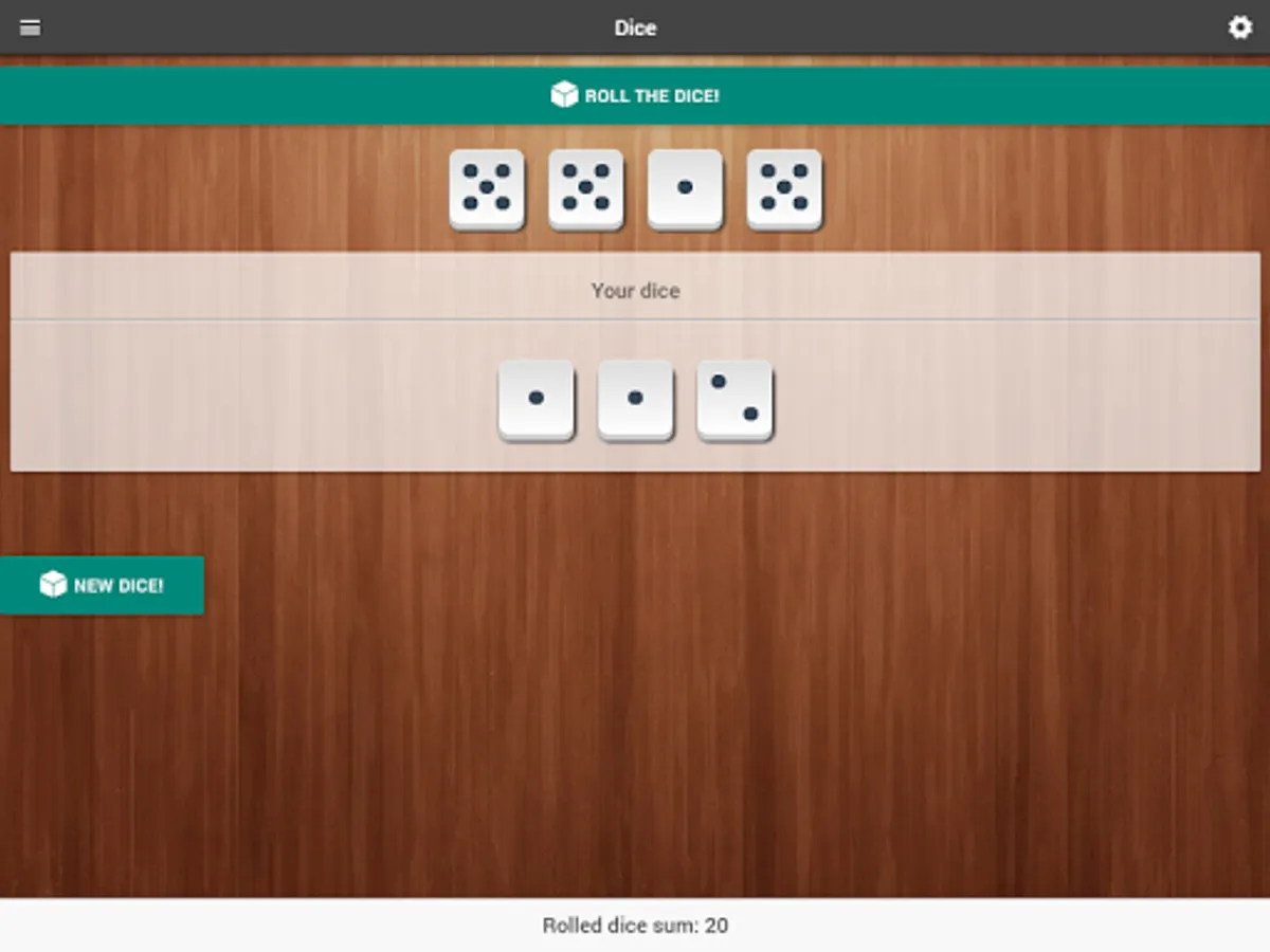 Dice! is free, simple, fast and highly customizable. In the app, you are able to roll multiple (up to ten) dice all at once, which makes it easy to use with almost any board game (mia, liar's dice, bunco and much more). You can also put dice aside to keep them and play on with the remaining ones. To do that simply tap the dice you want to keep. If you play with more than one die, it also shows the total sum of all rolled dice, which is perfect for playing board games.