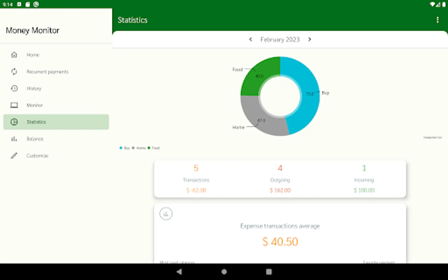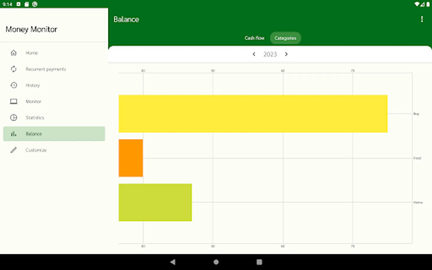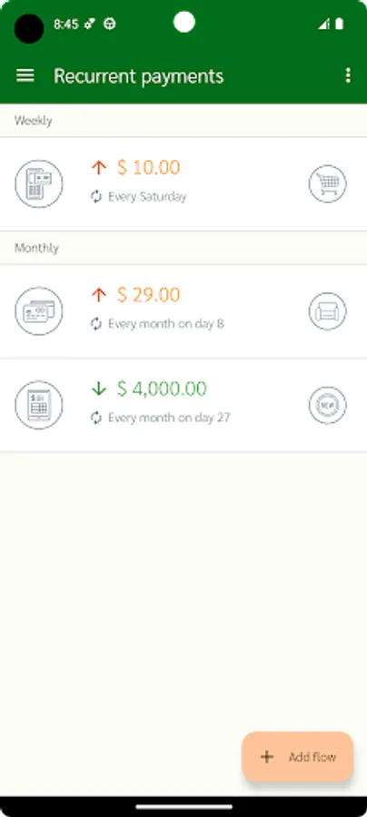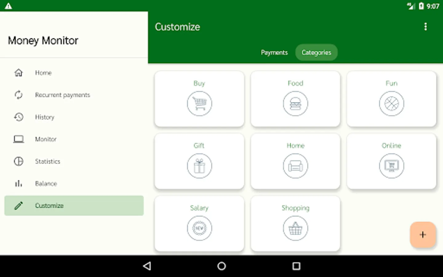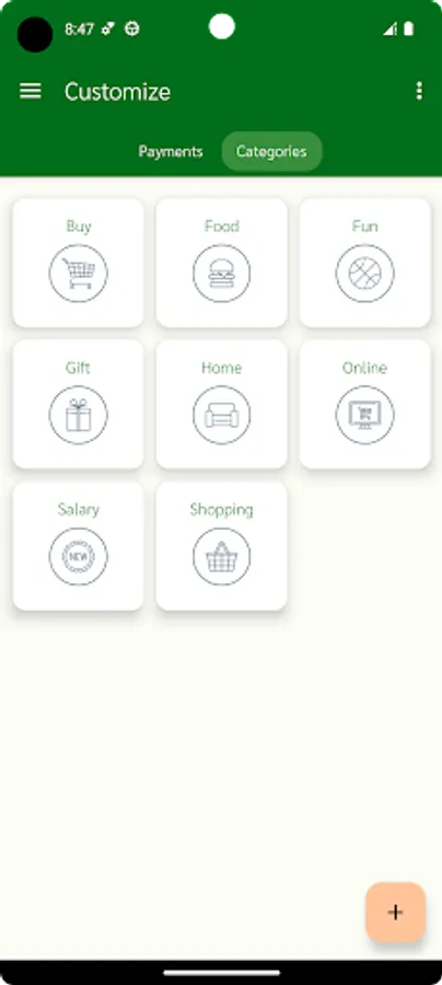 All category entries and payment methods can be customized in the "Customize" section. You can set the automatic addition of your salary once a month when the app is opened. Customizable currency.