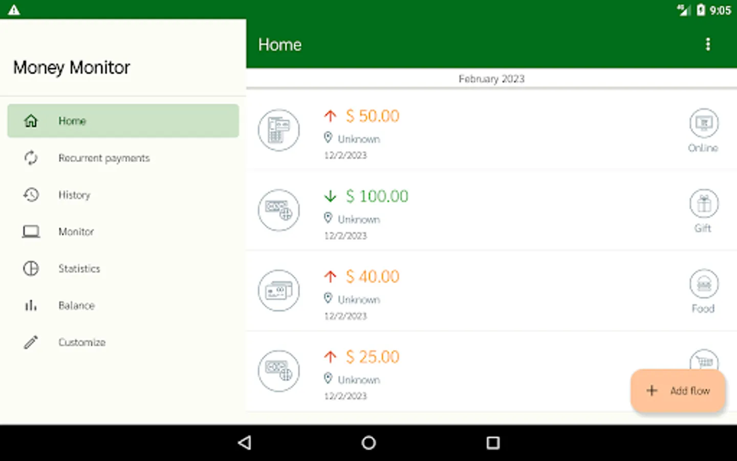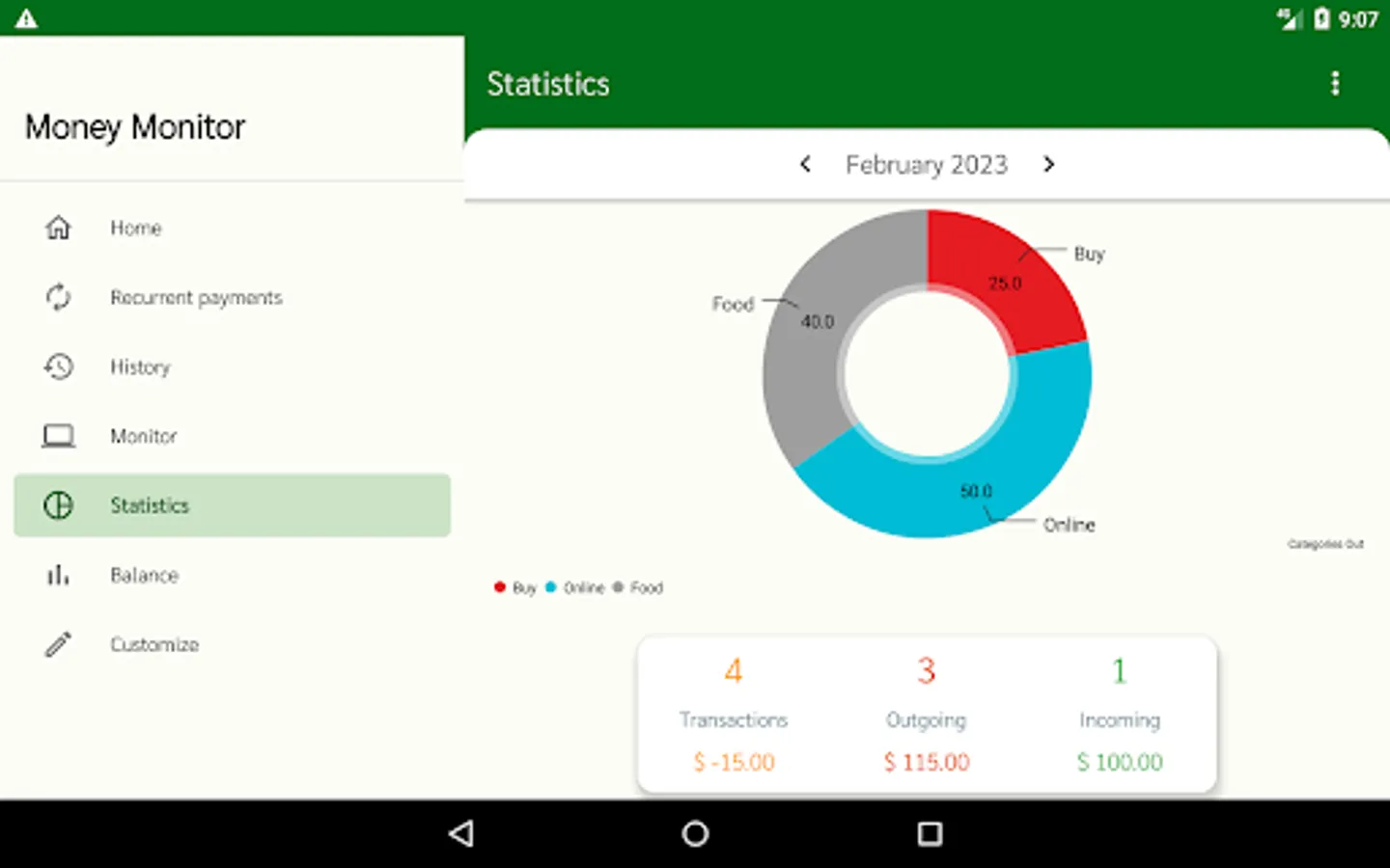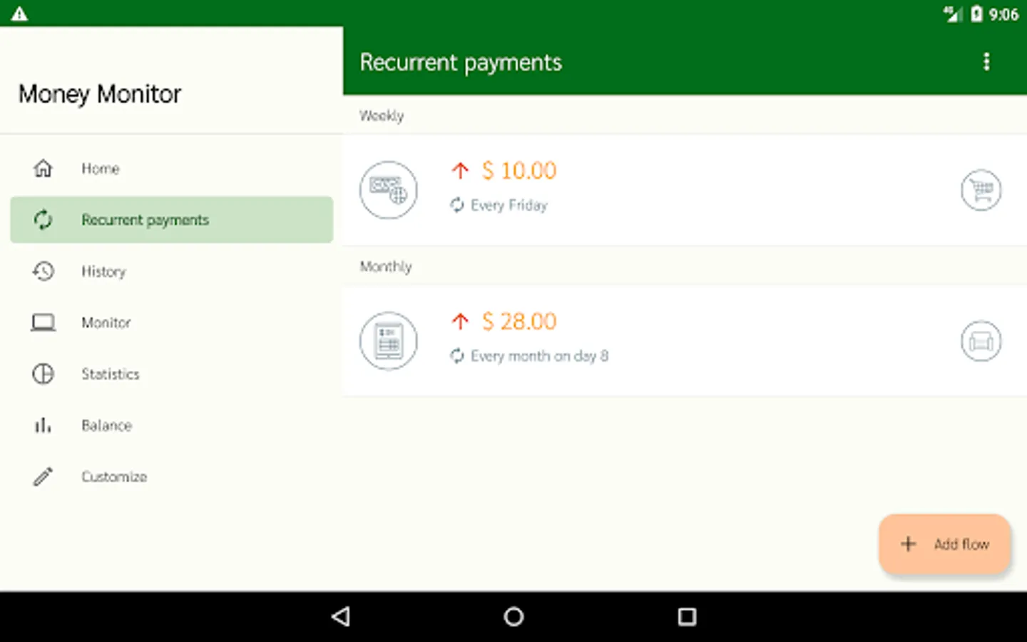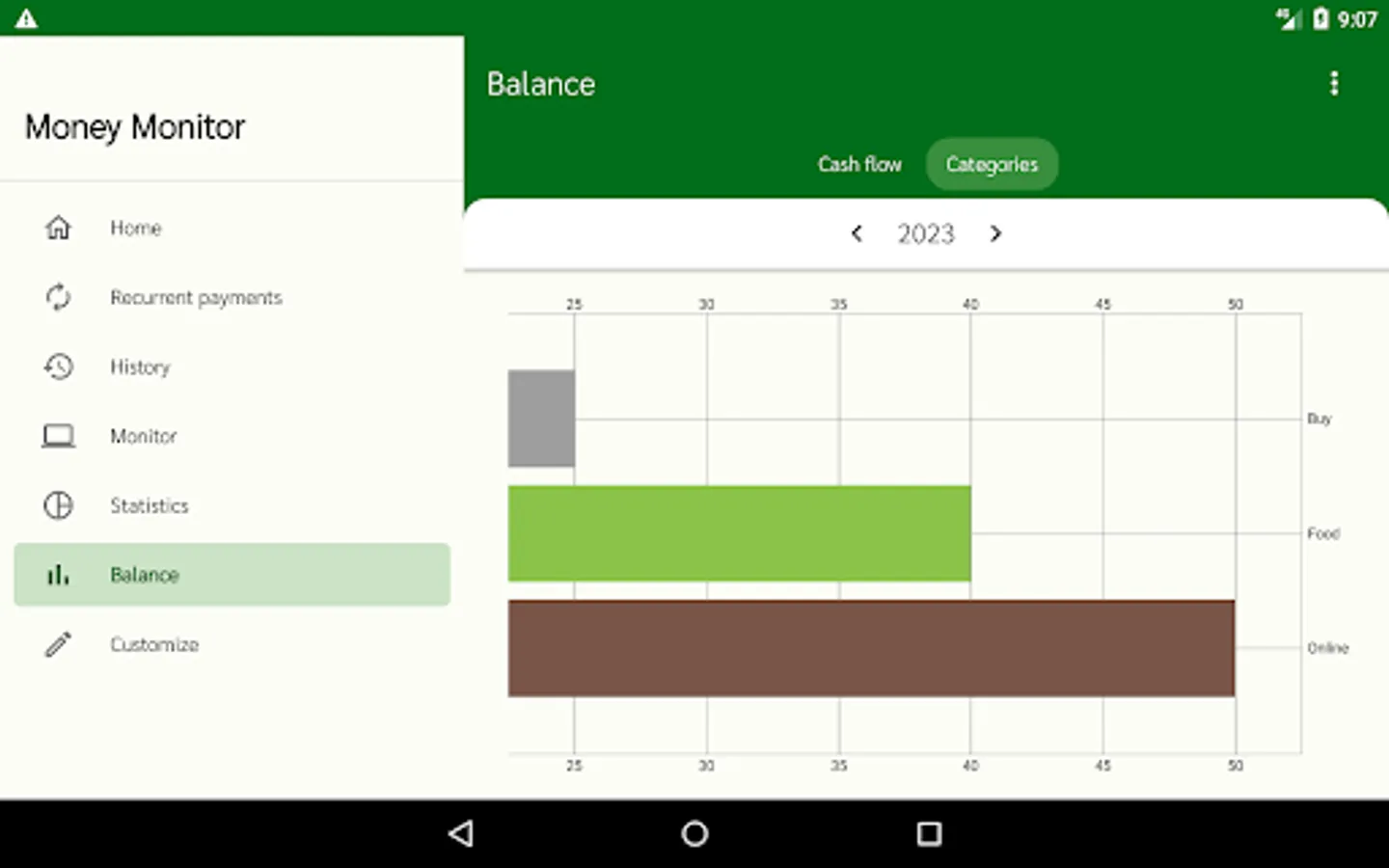 All category entries and payment methods can be customized in the "Customize" section. You can set the automatic addition of your salary once a month when the app is opened. Customizable currency.