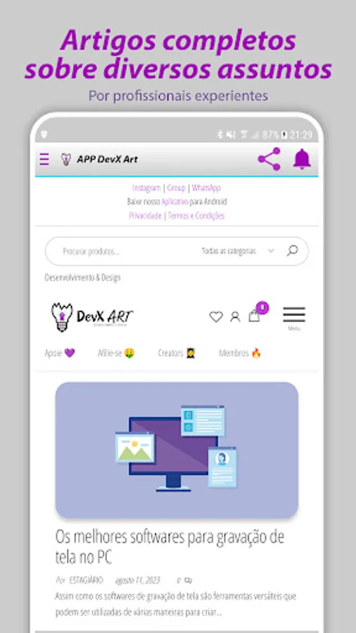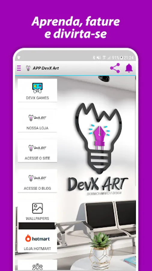 The DevX Art app has everything focused on development and design, in which you can find digital products, access to the blog with various tips and tutorials, free wallpapers for download, affiliate space, access to devx creators, a platform for creators, and also to several games to have fun whenever you want.
