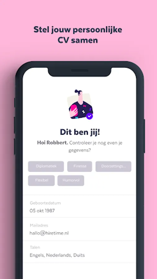 Hiretime makes it easy and fun to leave a good first impression with an employer. Once you have received an access code from an organization you can start by answering a number of questions, followed by a short video message which you will only send once you are satisfied! Instead of a cover letter and CV, you can briefly introduce yourself and / or show what you are good at through Hiretime. Hiretime supports you with useful tips!