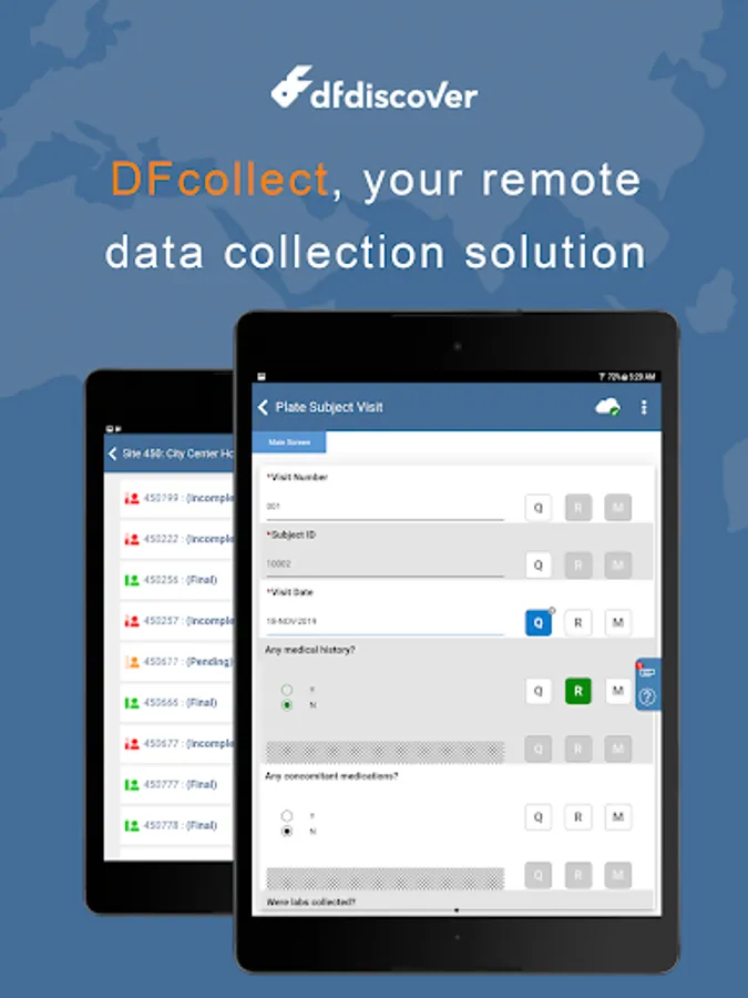 DFcollect is a data collection application. It allows users to perform online and offline data collection for a DFdiscover study.