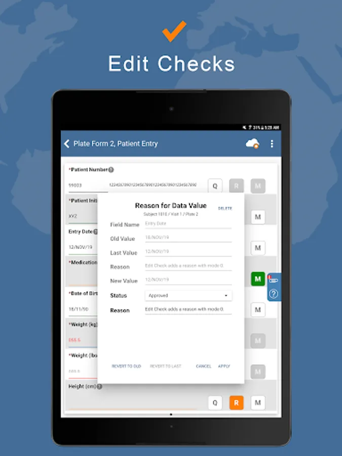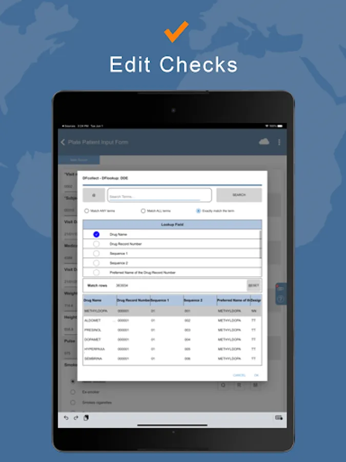 DFcollect has many data validation features that ensure quality data can be collected efficiently. These features include legal range checking, type validation, required values, field skipping, missing value coding, and edit checks. It also includes features to collect and manage metadata, such as data queries, reasons for data values and related study documents.