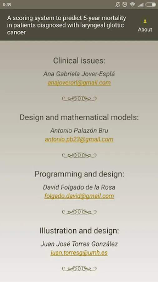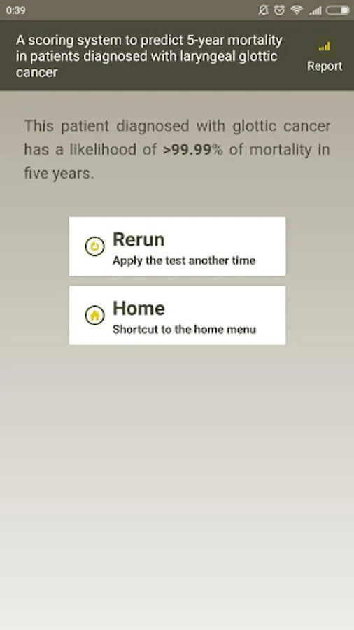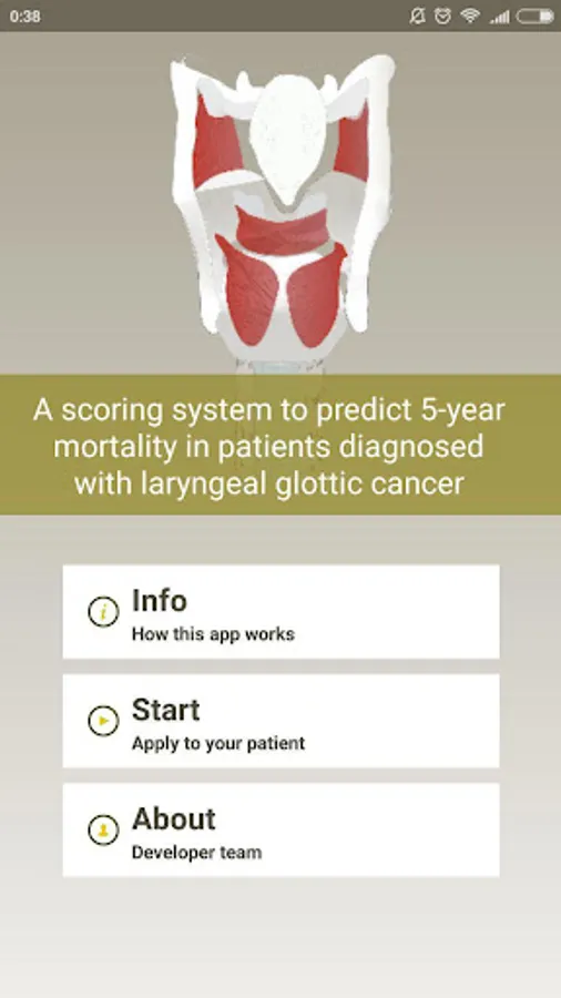 This mobile App is a medical calculator indicating the likelihood that a patient diagnosed with glottic cancer will die in five years