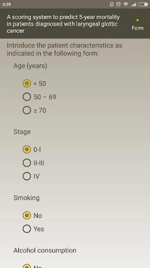 To give this likelihood the App will calculate a total score based on the risk of the above parameters. A patient will have a greater risk of death if that patient is older, has a higher stage, and a personal history of smoking and alcohol. According to the score the patient will have an associated probability of death.