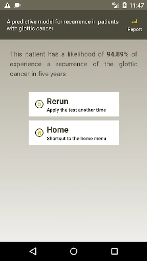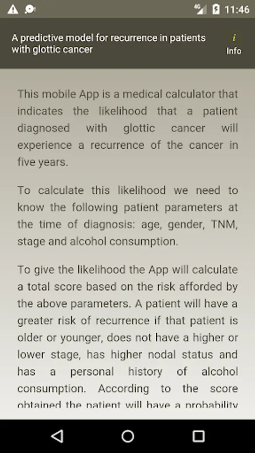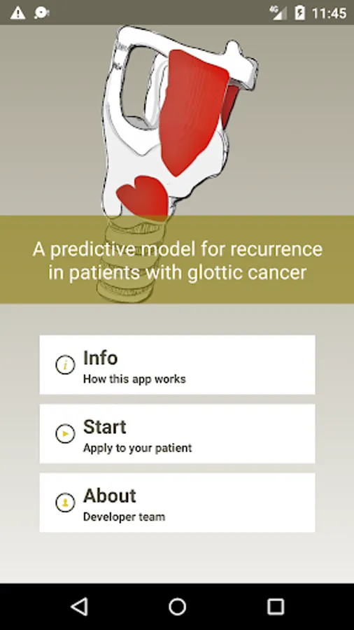 This mobile app is a medical calculator That Indicates That the likelihood a patient diagnosed With glottic cancer will experience a recurrence of the cancer in five years.