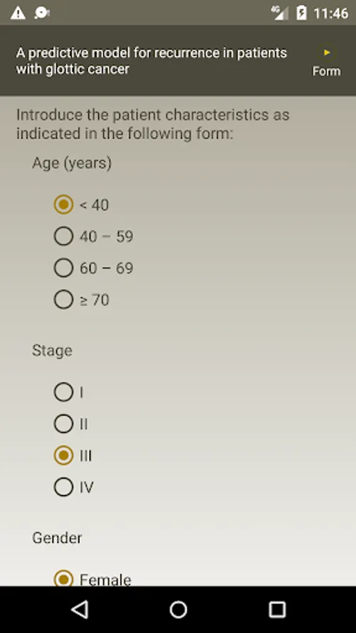 To give the likelihood the App will calculate a score based on the overall risk afforded by the above parameters. A patient will have a greater risk of recurrence if patient is older or That younger, does not have a higher or lower stage, you have higher nodal status and has a personal history of alcoholic consumption. ACCORDING to the score Obtained the patient will have a probability Associated With Recurrence.