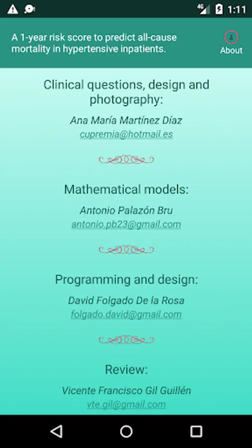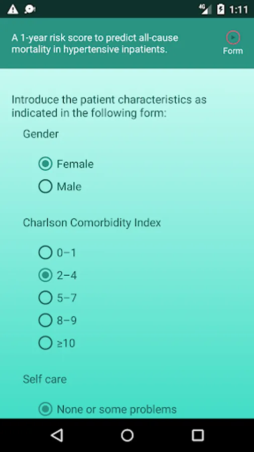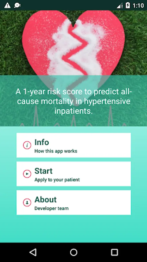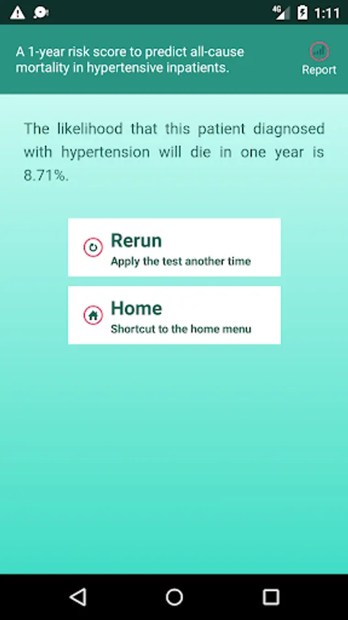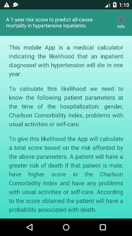 This mobile App is a medical calculator indicating the likelihood that an inpatient diagnosed with hypertension will die in one year.