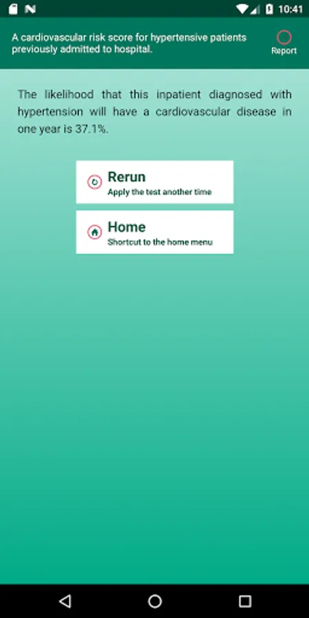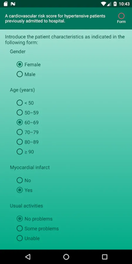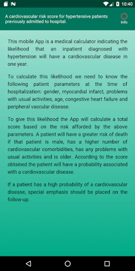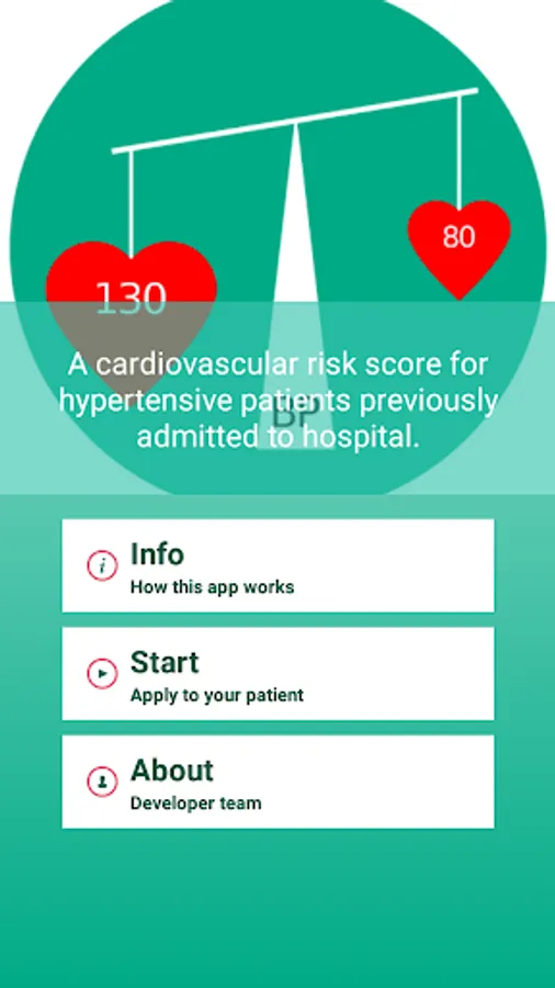 This mobile App is a medical calculator indicating the likelihood that an inpatient diagnosed with hypertension will have a cardiovascular disease in one year.
