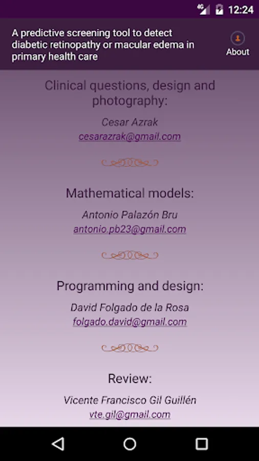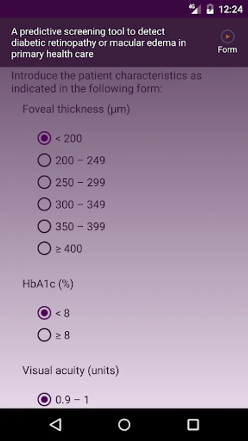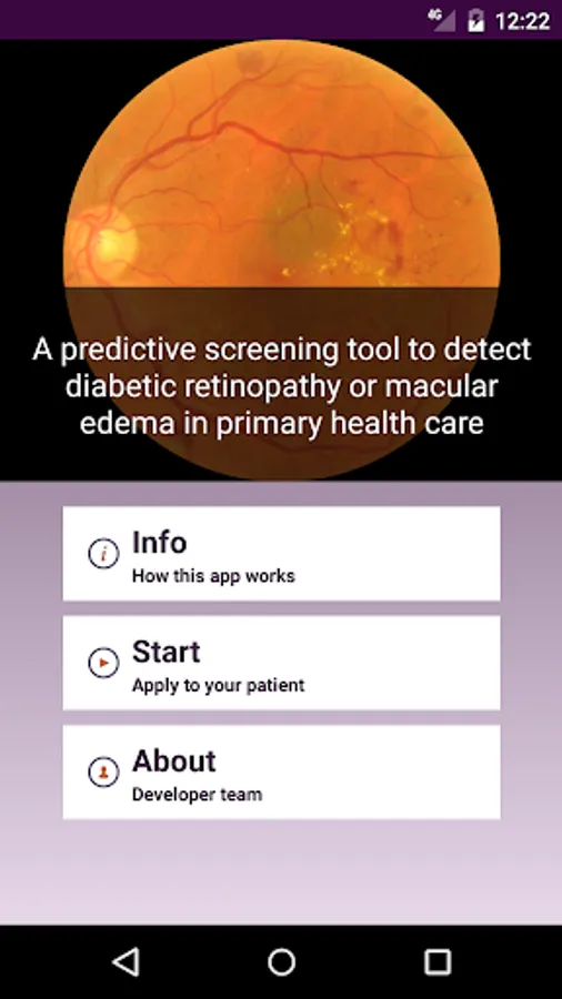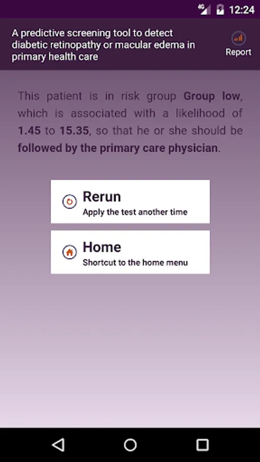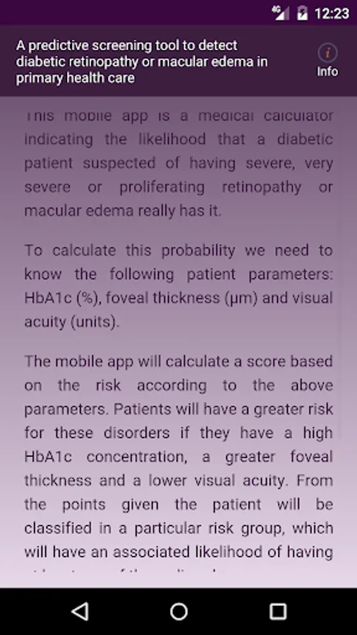 This mobile app is a medical calculator indicating the likelihood That a diabetic patient Suspected of Having severe, very severe or proliferating retinopathy or macular edema really have it.This mobile app is a medical calculator indicating the likelihood That a diabetic patient Suspected of Having severe, or very severe retinopathy or macular edema proliferating really has it.