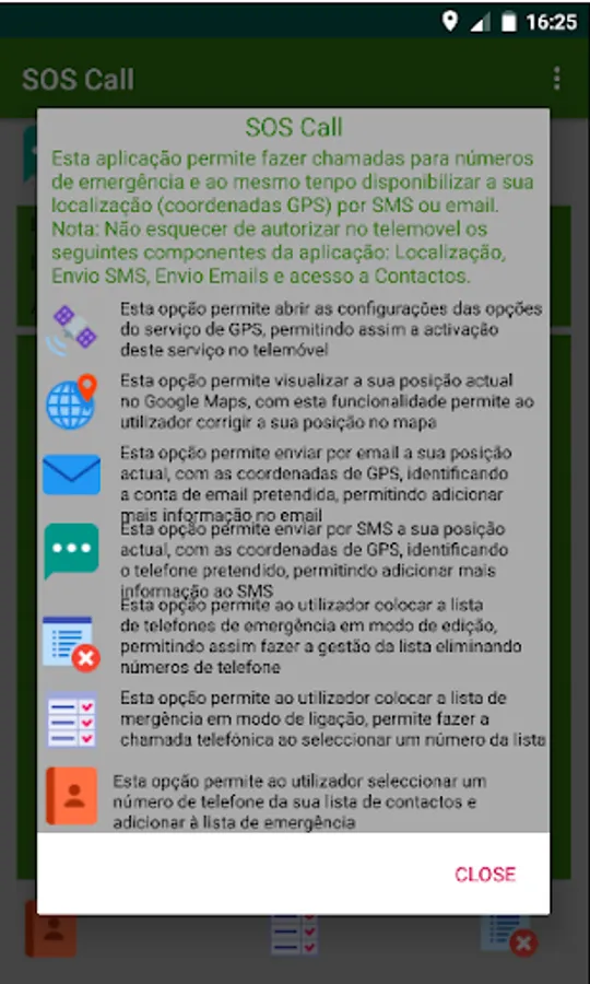 Application that allows you to make a emergency calls and at the same time send your location through GPS coordinates by text messaging and / or email. Note: Do not forget to authorize the following application components on your phone: Location, sending text messages, sending mails and accessing your Contacts.